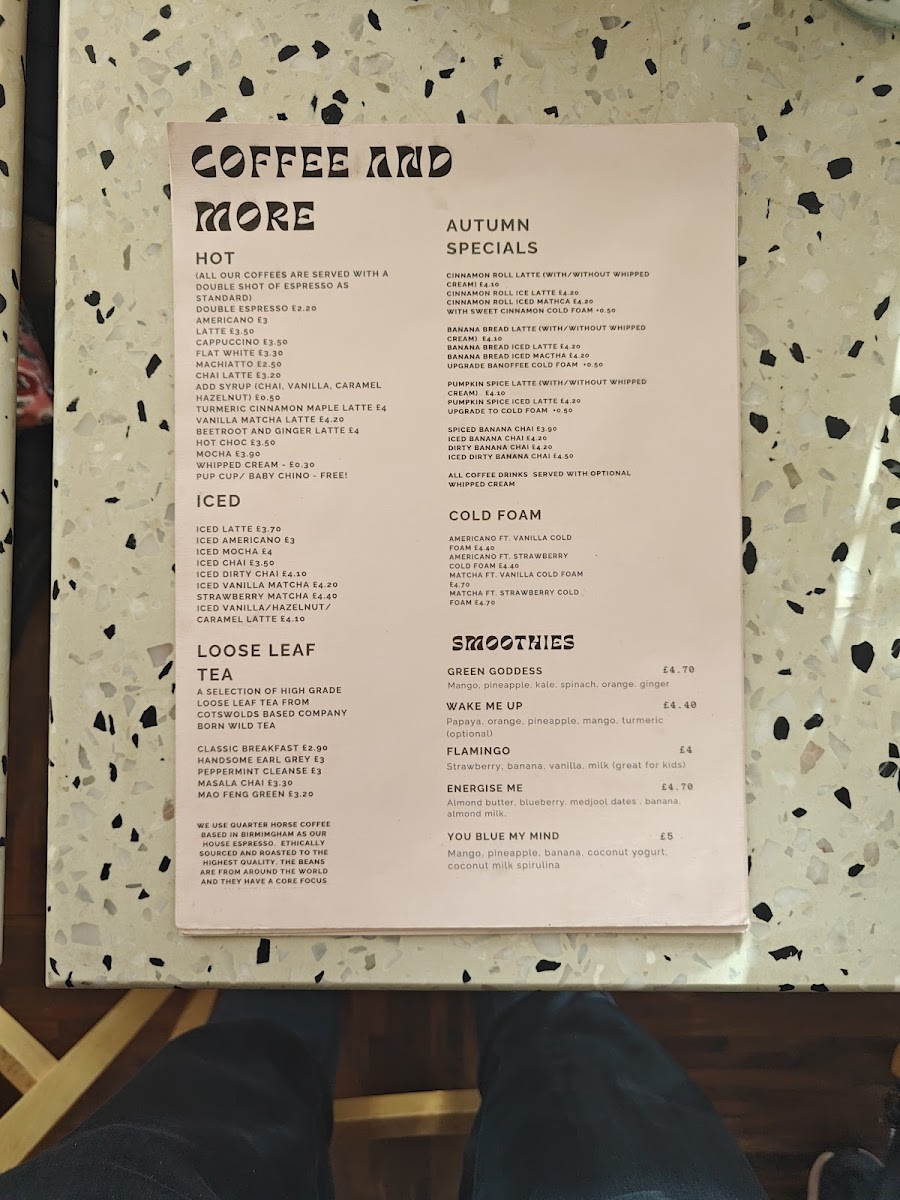 The drink menu features options that cater to different tastes, such as the earthy and soothing Turmeric Latte, the refreshing Iced Coffee, and the vibrant Matcha Latte. If you're looking for something warm and comforting, the Hot Chai Latte is a perfect choice. Pair your drink with a treat like the indulgent Nutella Knot or the crispy and flavorful Masala Toast for an unforgettable combination.